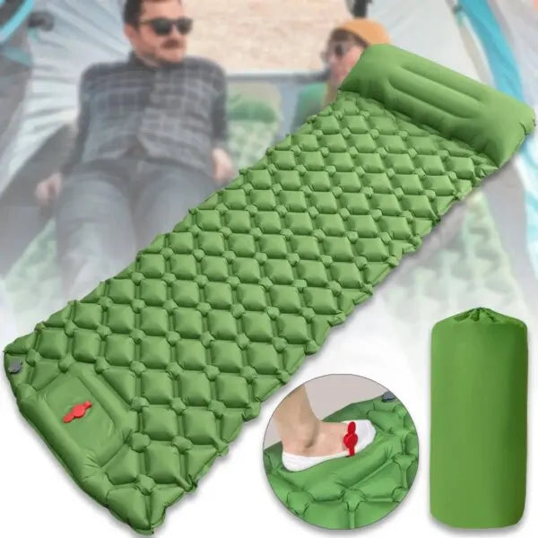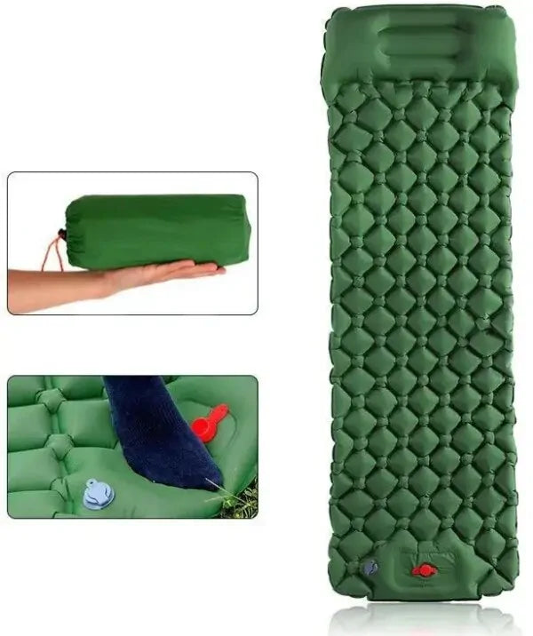 Цей зелений килимок розміром 190х60х5 см ідеально підходить для однієї людини та оснащений вбудованою подушкою і ножним насосом для швидкого та легкого надування без додаткового обладнання.